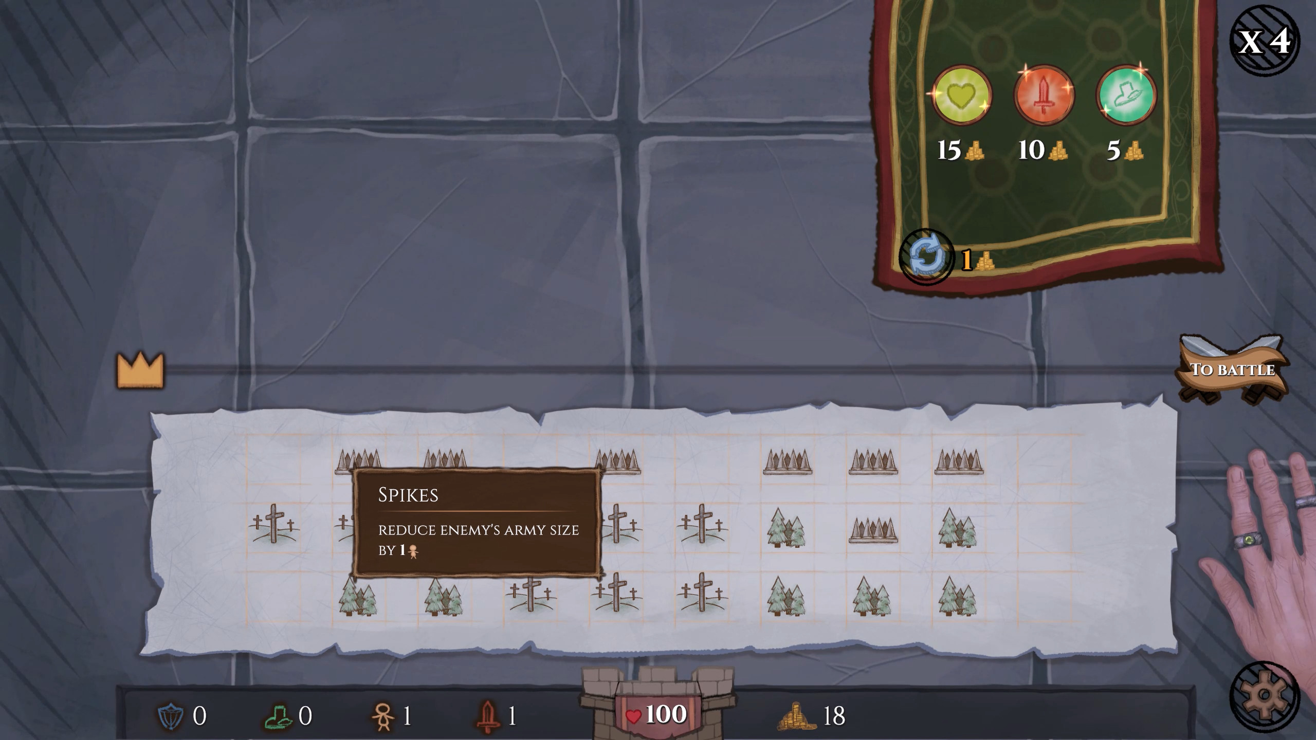 Cool game. I like the little visual details like the scroll unrolling towards the end, the walls impacting when you lose armor, and the little guys hopping off onto the UI. Mage tower might be a bit OP. It would be nice to have information about what each resource does when hovering (early on I had forgotten that units mult your damage and couldn’t figure out why I was doing zero damage). Gamefeel is good, though an optional speed increase would be welcome. I’m typically not a big fan of auto-battler type games but I liked this one.