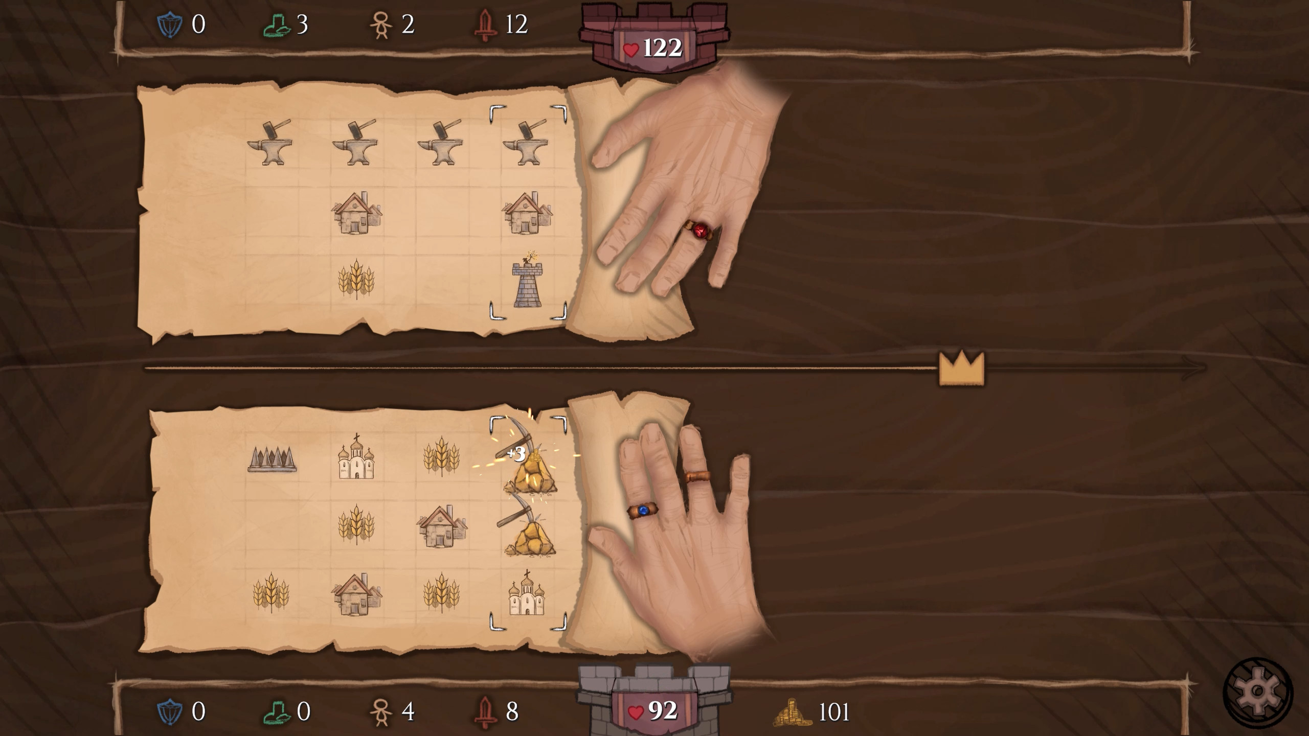 Прикольная задумка, но x3 mode бы не помешал. Некоторые карты, как мне показалось, юзлесс - та же кузница, башня или лошадь: есть альтернативы в разы лучше. Пшеница, которую можно комбинировать с домами (которые тебе и так нужны), выглядит куда выгоднее. А церкви - это вообще лютый имбаланс: построил три церкви, и противник в 80% случаев не может перебить хил, а так игра понравилась